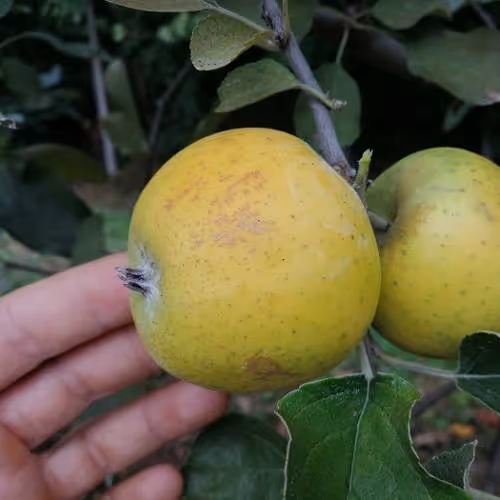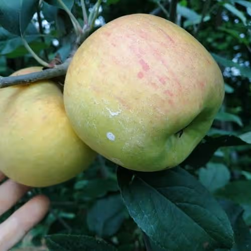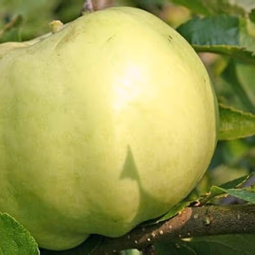Rast je bujna, rodnost je dobra.Plodovi so srednje debeli, ploščate oblike in rahlo rebrasti.Kožica je gladka, na začetku zelena potem pa postane rumena. Meso je trdo, ne občutljivo na prstne odtise, sočno in značilno kislega okusa. Se dobro skladišči.